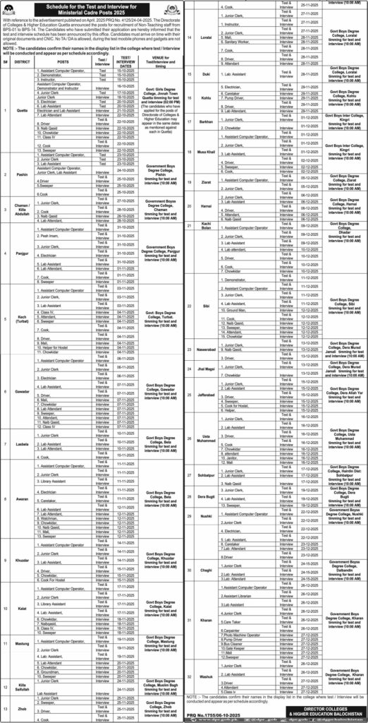 As per the advertisement in the Newspaper on October 8, 2025, Colleges & Higher Education Quetta, Balochistan, has posted job openings for many positions, including